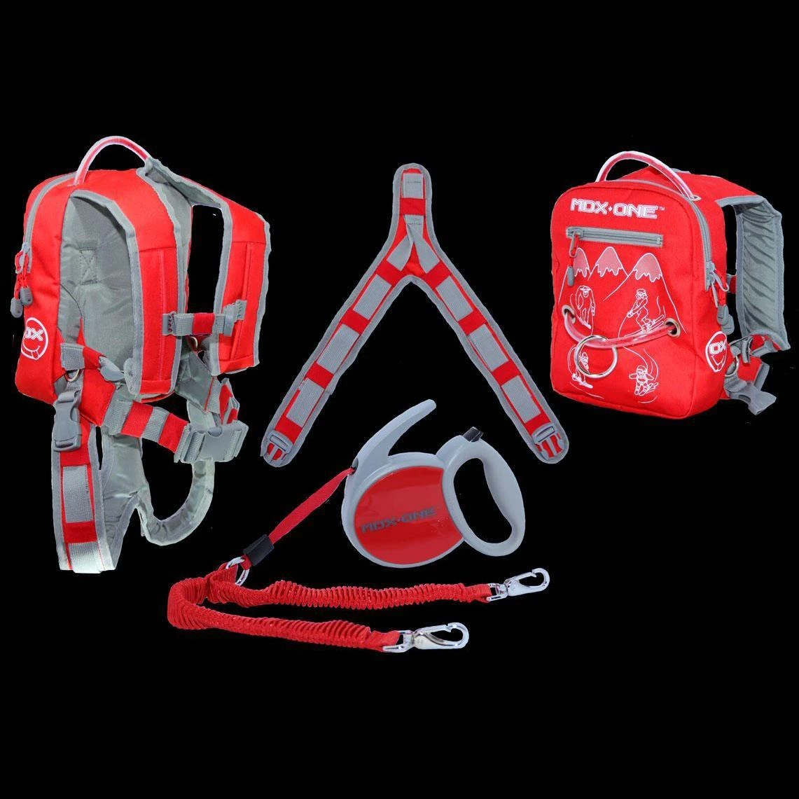 - MDXONE “OX” has a 16 feet retractable red tape/cord with two 12” bungee cords at the end to connect to the Backpack/harness attachment points.